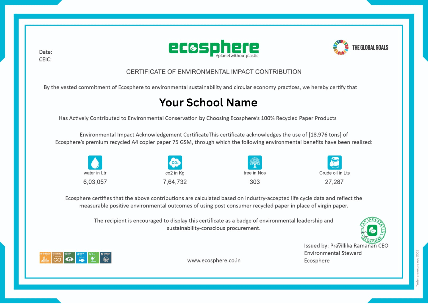 Ecosphere is BSI & FSC certified, delivering globally trusted sustainable paper for schools. Adopting Ecosphere earns your institution an annual Green School Certificate with measurable carbon, water, and waste-saving impact.